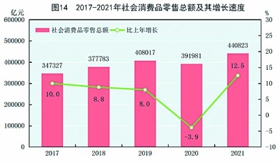 全年社會(huì)消費(fèi)品零售總額440823億元,比上年增長(zhǎng)12.5%。按經(jīng)營(yíng)地統(tǒng)計(jì),城鎮(zhèn)消費(fèi)品零售額381558億元,增長(zhǎng)12.5%;鄉(xiāng)村消費(fèi)品零售額59265億元,增長(zhǎng)12.1%。按消費(fèi)類(lèi)型統(tǒng)計(jì),商品零售額393928億元,增長(zhǎng)11.8%;餐飲收入額46895億元,增長(zhǎng)18.6%。(見(jiàn)圖14)