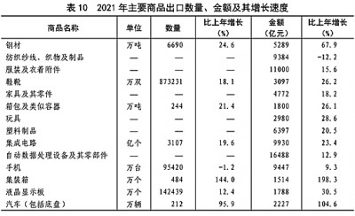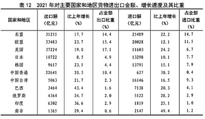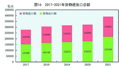 全年貨物進(jìn)出口總額391009億元,比上年增長(zhǎng)21.4%。其中,出口217348億元,增長(zhǎng)21.2%;進(jìn)口173661億元,增長(zhǎng)21.5%。貨物進(jìn)出口順差43687億元,比上年增加7344億元。對(duì)“一帶一路”[44]沿線(xiàn)國(guó)家進(jìn)出口總額115979億元,比上年增長(zhǎng)23.6%。其中,出口65924億元,增長(zhǎng)21.5%;進(jìn)口50055億元,增長(zhǎng)26.4%。(見(jiàn)圖16)(見(jiàn)表9)(見(jiàn)表10)(見(jiàn)表11)(見(jiàn)表12)