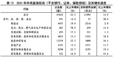 全年外商直接投資(不含銀行、證券、保險(xiǎn)領(lǐng)域)新設(shè)立企業(yè)47643家,比上年增長(zhǎng)23.5%。實(shí)際使用外商直接投資金額11494億元,增長(zhǎng)14.9%,折1735億美元,增長(zhǎng)20.2%。其中“一帶一路”沿線(xiàn)國(guó)家對(duì)華直接投資(含通過(guò)部分自由港對(duì)華投資)新設(shè)立企業(yè)5336家,增長(zhǎng)24.3%;對(duì)華直接投資金額743億元,增長(zhǎng)29.4%,折112億美元,增長(zhǎng)36.0%。全年高技術(shù)產(chǎn)業(yè)實(shí)際使用外資3469億元,增長(zhǎng)17.1%,折522億美元,增長(zhǎng)22.1%。(見(jiàn)表13)