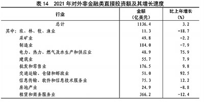 全年對(duì)外非金融類(lèi)直接投資額7332億元,比上年下降3.5%,折1136億美元,增長(zhǎng)3.2%。其中,對(duì)“一帶一路”沿線(xiàn)國(guó)家非金融類(lèi)直接投資額203億美元,增長(zhǎng)14.1%。(見(jiàn)表14)
