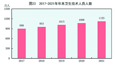 年末全國(guó)共有醫(yī)療衛(wèi)生機(jī)構(gòu)103.1萬(wàn)個(gè),其中醫(yī)院3.7萬(wàn)個(gè),在醫(yī)院中有公立醫(yī)院1.2萬(wàn)個(gè),民營(yíng)醫(yī)院2.5萬(wàn)個(gè);基層醫(yī)療衛(wèi)生機(jī)構(gòu)97.7萬(wàn)個(gè),其中鄉(xiāng)鎮(zhèn)衛(wèi)生院3.5萬(wàn)個(gè),社區(qū)衛(wèi)生服務(wù)中心(站)3.6萬(wàn)個(gè),門(mén)診部(所)30.7萬(wàn)個(gè),村衛(wèi)生室59.9萬(wàn)個(gè);專(zhuān)業(yè)公共衛(wèi)生機(jī)構(gòu)1.3萬(wàn)個(gè),其中疾病預(yù)防控制中心3380個(gè),衛(wèi)生監(jiān)督所(中心)2790個(gè)。年末衛(wèi)生技術(shù)人員1123萬(wàn)人,其中執(zhí)業(yè)醫(yī)師和執(zhí)業(yè)助理醫(yī)師427萬(wàn)人,注冊(cè)護(hù)士502萬(wàn)人。醫(yī)療衛(wèi)生機(jī)構(gòu)床位957萬(wàn)張,其中醫(yī)院748萬(wàn)張,鄉(xiāng)鎮(zhèn)衛(wèi)生院144萬(wàn)張。全年總診療人次[70]85.3億人次,出院人數(shù)[71]2.4億人。截至年末,全國(guó)累計(jì)報(bào)告新型冠狀病毒肺炎確診病例102314例,累計(jì)治愈出院病例94792例,累計(jì)死亡4636人。全國(guó)累計(jì)報(bào)告接種新型冠狀病毒疫苗283533萬(wàn)劑次。全國(guó)共有11937家醫(yī)療衛(wèi)生機(jī)構(gòu)提供新型冠狀病毒核酸檢測(cè)服務(wù),總檢測(cè)能力達(dá)到4168萬(wàn)份/天。(見(jiàn)圖23)
