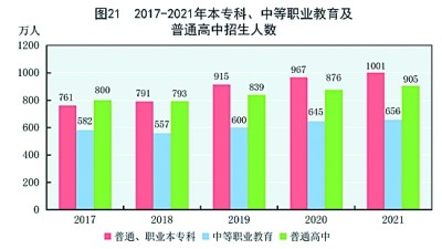 全年研究生教育招生117.7萬(wàn)人,在學(xué)研究生333.2萬(wàn)人,畢業(yè)生77.3萬(wàn)人。普通、職業(yè)本專(zhuān)科[65]招生1001.3萬(wàn)人,在校生3496.1萬(wàn)人,畢業(yè)生826.5萬(wàn)人。中等職業(yè)教育[66]招生656.2萬(wàn)人,在校生1738.5萬(wàn)人,畢業(yè)生484.1萬(wàn)人。普通高中招生905.0萬(wàn)人,在校生2605.0萬(wàn)人,畢業(yè)生780.2萬(wàn)人。初中招生1705.4萬(wàn)人,在校生5018.4萬(wàn)人,畢業(yè)生1587.1萬(wàn)人。普通小學(xué)招生1782.6萬(wàn)人,在校生10779.9萬(wàn)人,畢業(yè)生1718.0萬(wàn)人。特殊教育招生14.9萬(wàn)人,在校生92.0萬(wàn)人,畢業(yè)生14.6萬(wàn)人。學(xué)前教育在園幼兒4805.2萬(wàn)人。九年義務(wù)教育鞏固率為95.4%,高中階段毛入學(xué)率為91.4%。(見(jiàn)圖21)