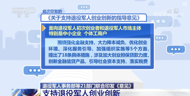 此次印發(fā)的《關(guān)于支持退役軍人創(chuàng)業(yè)創(chuàng)新的指導(dǎo)意見(jiàn)》,面向退役軍人初次創(chuàng)業(yè)者和退役軍人市場(chǎng)主體,特別是中小企業(yè)、個(gè)體工商戶。圍繞強(qiáng)化金融支持、大力降本減負(fù)、優(yōu)化創(chuàng)業(yè)環(huán)境、深化服務(wù)引導(dǎo)、加強(qiáng)組織實(shí)施等5個(gè)方面,提出了18條具體措施,涉及加大創(chuàng)業(yè)擔(dān)保貸款力度、創(chuàng)新金融信貸產(chǎn)品、引導(dǎo)社會(huì)資本支持、落實(shí)稅費(fèi)減免、緩解租金壓力、優(yōu)化供地保障、落實(shí)補(bǔ)貼優(yōu)惠、完善公共服務(wù)、開展創(chuàng)業(yè)培訓(xùn)、加強(qiáng)個(gè)體工商戶引導(dǎo)扶持等,進(jìn)一步提升退役軍人創(chuàng)業(yè)創(chuàng)新能力,培育壯大退役軍人市場(chǎng)主體,帶動(dòng)更多退役軍人就業(yè)。