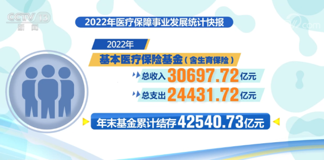 2022年,基本醫(yī)療保險基金(含生育保險)總收入、總支出分別為30697.72億元、24431.72億元,年末基金累計結(jié)存42540.73億元。