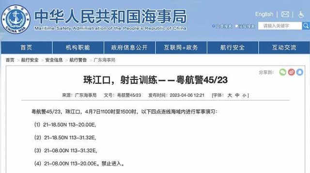央視網(wǎng)消息:據(jù)中國海事局網(wǎng)站消息,廣東海事局發(fā)布航行警告,4月7日11時至15時,珠江口部分海域內(nèi)將進(jìn)行軍事演習(xí),禁止進(jìn)入。