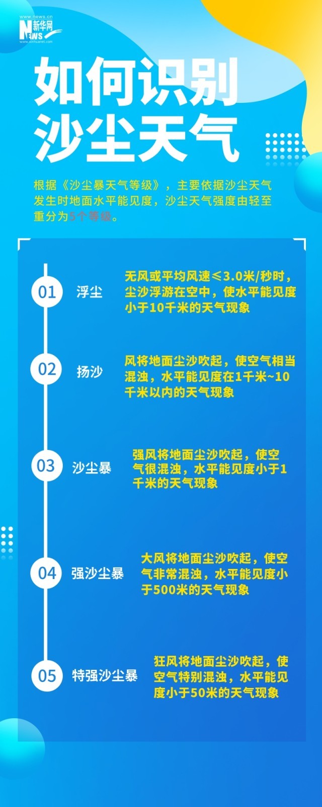 沙塵天氣是指風(fēng)將地面塵土、沙粒卷入空中,使空氣混濁的天氣現(xiàn)象。根據(jù)《沙塵暴天氣等級》,主要依據(jù)沙塵天氣發(fā)生時(shí)地面水平能見度,沙塵天氣強(qiáng)度由輕至重分為5個(gè)等級。