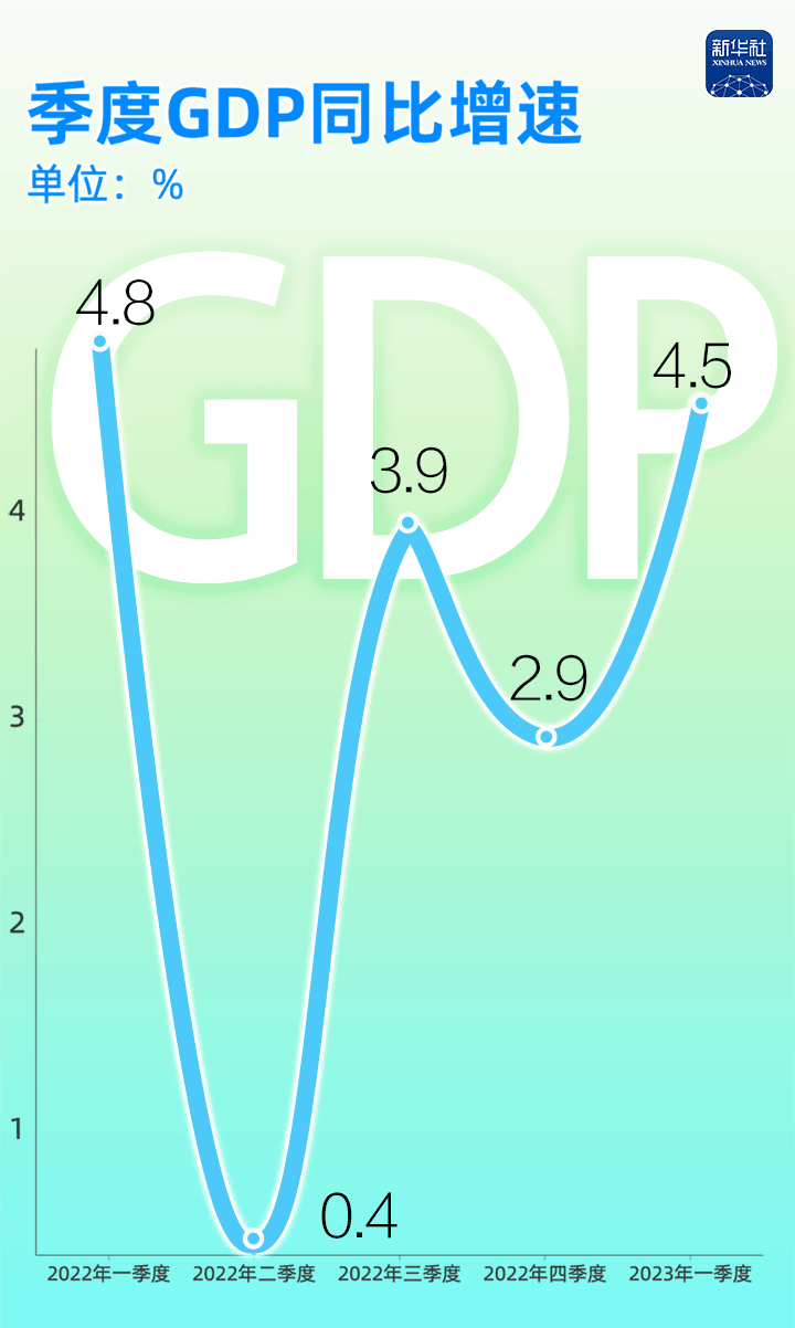 有數為證:2022年至今,我國的季度GDP同比增速分別為4.8%、0.4%、3.9%、2.9%和4.5%,一季度GDP增速達到了2022年二季度以來最高水平。