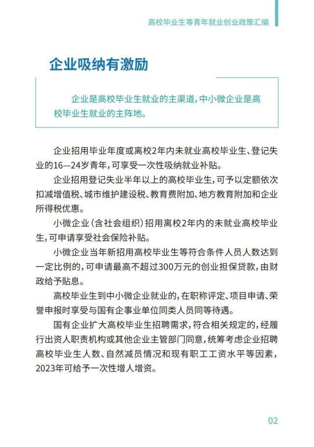 《匯編》系統(tǒng)梳理了國家有關(guān)部門出臺的促進高校畢業(yè)生就業(yè)創(chuàng)業(yè)現(xiàn)行政策,聚焦高校畢業(yè)生求職就業(yè)需求,分為企業(yè)就業(yè)、基層就業(yè)、自主創(chuàng)業(yè)、能力提升、應(yīng)征入伍、就業(yè)見習(xí)、就業(yè)服務(wù)、就業(yè)手續(xù)、權(quán)益維護等九方面內(nèi)容。為便于高校畢業(yè)生和企業(yè)快速查閱相關(guān)政策,《匯編》還歸納整理了就業(yè)有關(guān)政策清單,包括6項面向企業(yè)(單位)吸納高校畢業(yè)生就業(yè)的補貼、稅收優(yōu)惠等政策,以及9項面向高校畢業(yè)生的補貼、資助等政策。