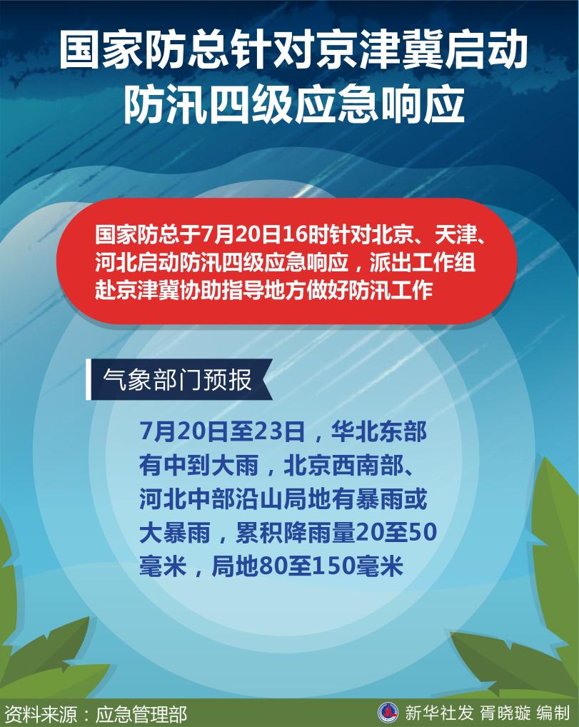 新華社北京7月20日電(記者周圓)記者20日從應(yīng)急管理部獲悉,國家防總于當(dāng)日16時(shí)針對北京、天津、河北啟動防汛四級應(yīng)急響應(yīng),派出工作組赴京津冀協(xié)助指導(dǎo)地方做好防汛工作。