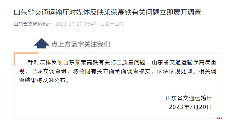 針對媒體反映山東萊榮高鐵有關(guān)施工質(zhì)量問題,山東省交通運輸廳高度重視,已成立調(diào)查組,將會同有關(guān)方面全面調(diào)查核實,依法依規(guī)處理。相關(guān)調(diào)查結(jié)果將及時公布。