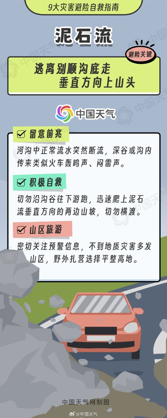 雨后山區(qū)道路沿線易發(fā)生落石,大家請(qǐng)避免在陡峭石壁或凸石下停留,當(dāng)災(zāi)害發(fā)生時(shí)要迅速向崩塌體兩側(cè)逃生;房前屋后土體突然鼓脹,局部出現(xiàn)滑塌或裂縫,并有水流滲出時(shí),要警惕滑坡災(zāi)害,快速向滑動(dòng)方向兩側(cè)逃離;地面出現(xiàn)環(huán)狀裂縫,地形下凹或地表水快速滲漏,建筑物出現(xiàn)傾斜開裂時(shí),要迅速遠(yuǎn)離沉陷地帶。