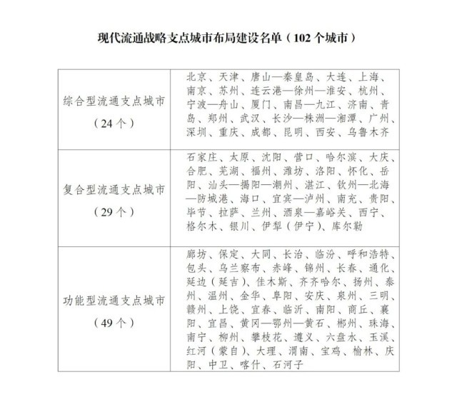 《通知》堅持系統(tǒng)思維和全局觀念,突出國家所需和城市所長,按照服務重要商品和資源要素流通、強化跨域跨界輻射帶動、促進現(xiàn)代流通發(fā)展等三個維度布局流通支點城市。綜合考慮城市資源稟賦、發(fā)展基礎、比較優(yōu)勢、未來潛力,將102個城市納入布局建設范圍,覆蓋全國31個省區(qū)市以及新疆生產建設兵團。流通支點城市將按綜合型、復合型、功能型分類推進建設,城市人民政府發(fā)揮主體作用部署推進,努力提升自身發(fā)展水平,增強輻射帶動作用。