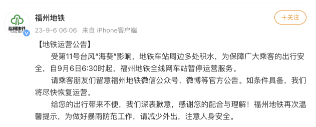 央視網消息:據@福州地鐵 微博消息,受第11號臺風“??庇绊?,地鐵車站周邊多處積水,為保障廣大乘客的出行安全,自9月6日6:30時起,福州地鐵全線網車站暫停運營服務。如條件具備,將盡快恢復運營。