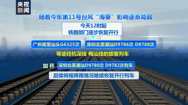 廣東:“海葵”減弱 受影響列車陸續(xù)恢復(fù)開行