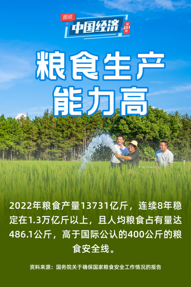 今年以來,極端氣候干擾全球農(nóng)業(yè)生產(chǎn),關(guān)于糧食安全的擔(dān)憂在全球蔓延。就我國(guó)糧食生產(chǎn)情況而言,國(guó)務(wù)院關(guān)于確保國(guó)家糧食安全工作情況的報(bào)告顯示,2022年,我國(guó)糧食產(chǎn)量13731億斤,連續(xù)8年穩(wěn)定在1.3萬(wàn)億斤以上,且人均糧食占有量達(dá)486.1公斤,高于國(guó)際公認(rèn)的400公斤的糧食安全線。