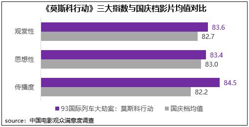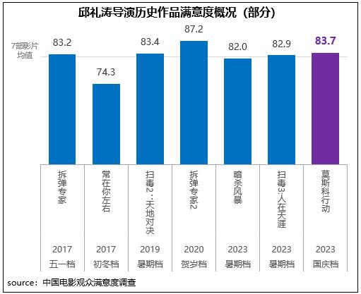 邱禮濤導演執(zhí)導的警匪動作電影《93國際列車大劫案:莫斯科行動》獲得觀眾滿意度評分83.7分,與檔期第一名和第二名僅差0.4分和0.1分;在滿意度調(diào)查過的邱禮濤導演七部影片中,《莫斯科行動》滿意度處在平均水平之上。