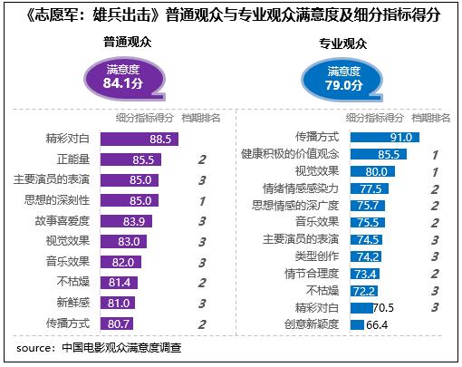 陳凱歌執(zhí)導的抗美援朝題材影片《志愿軍:雄兵出擊》觀眾滿意度83.8分,與檔期第一名分差僅0.3分。