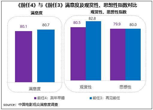 由田羽生執(zhí)導,韓庚、鄭愷主演的都市愛情輕喜劇電影《前任4:英年早婚》觀眾滿意度80.1分,與六年前上映的系列上一部《前任3:再見前任》相差不大,略下降0.6分;其中二者思想性得分幾近持平,觀賞性下降了2.3分。