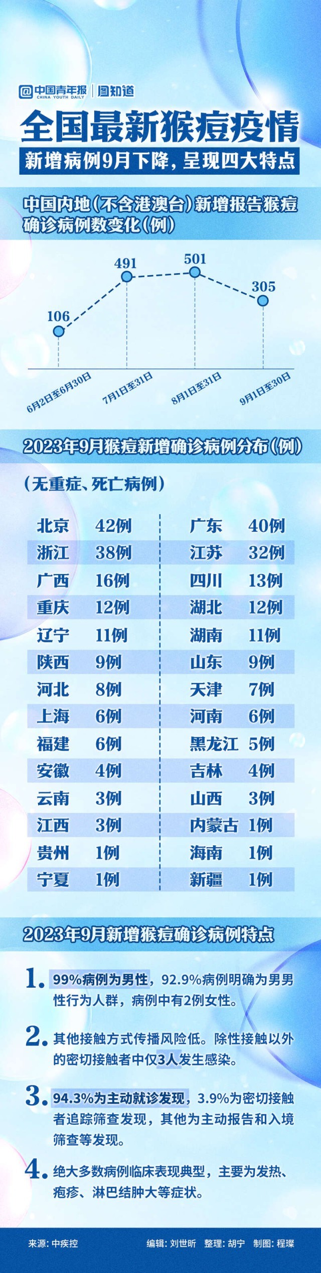 10月16日,中疾控發(fā)布2023年9月猴痘疫情監(jiān)測情況,28個?。ㄊ小^(qū))共報告新增確診病例305例。新發(fā)病例呈現(xiàn)四大特點。一起來看。