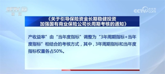 《通知》明確,為引導(dǎo)國有商業(yè)保險(xiǎn)公司長(zhǎng)期穩(wěn)健經(jīng)營(yíng),更好發(fā)揮中長(zhǎng)期資金的市場(chǎng)穩(wěn)定器和經(jīng)濟(jì)發(fā)展助推器作用,加強(qiáng)對(duì)國有商業(yè)保險(xiǎn)公司的長(zhǎng)周期考核,根據(jù)《財(cái)政部關(guān)于印發(fā)<商業(yè)保險(xiǎn)公司績(jī)效評(píng)價(jià)辦法>的通知》,將經(jīng)營(yíng)效益指標(biāo)的“凈資產(chǎn)收益率”由“當(dāng)年度指標(biāo)”調(diào)整為“3年周期指標(biāo)+當(dāng)年度指標(biāo)”相結(jié)合的考核方式,其中,3年周期指標(biāo)和當(dāng)年度指標(biāo)權(quán)重各占50%。