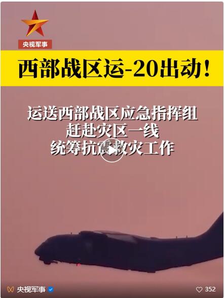 今天上午9時(shí)50分左右,西部戰(zhàn)區(qū)空軍1架運(yùn)-20從西南某軍用機(jī)場(chǎng)起飛,運(yùn)送西部戰(zhàn)區(qū)應(yīng)急指揮組趕赴災(zāi)區(qū)一線,統(tǒng)籌抗震救災(zāi)工作。運(yùn)-20已于11點(diǎn)左右抵達(dá)蘭州中川機(jī)場(chǎng)。