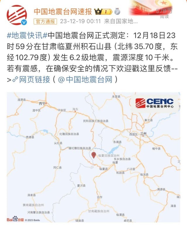 12月18日23時59分,甘肅臨夏州積石山縣發(fā)生6.2級地震,震源深度10公里,距離最近高鐵線路近60公里,甘肅多地震感明顯。