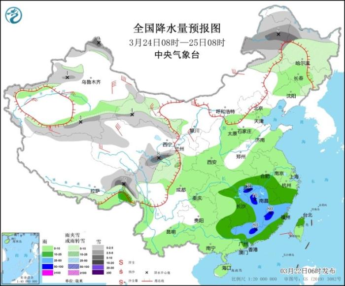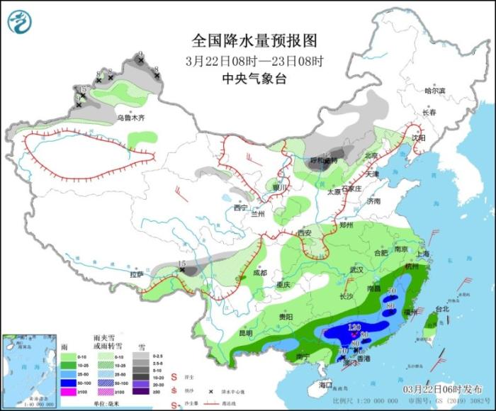 3月22日08時(shí)至23日08時(shí),內(nèi)蒙古中東部、新疆北部、西藏東部、甘肅中部、陜西北部和東南部、山西北部、河北西北部、北京西北部、遼寧西部等地部分地區(qū)有小到中雪或雨夾雪,其中,新疆北疆北部和伊犁河谷、西藏東北部、內(nèi)蒙古中部、山西北部等地部分地區(qū)有大到暴雪(10~15毫米)。江南中東部和南部、云南東南部、華南大部、臺(tái)灣島等地部分地區(qū)有中到大雨,其中,江西南部、福建西部、廣西東北部、廣東中北部及西部沿海等地局部地區(qū)有暴雨或大暴雨(100~120毫米)。內(nèi)蒙古西北部、青海北部、江南南部、華南北部等地部分地區(qū)有4~5級(jí)風(fēng)(見圖2)。