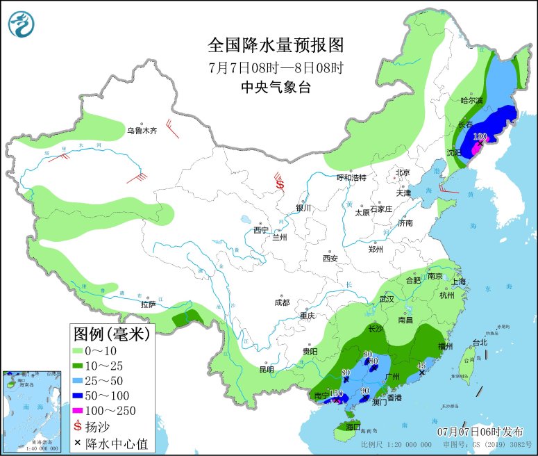 7月7日08時至8日08時,遼寧東部、吉林中東部、黑龍江東部、廣西中東部、廣東西部和東南部等地有大到暴雨,其中,吉林東南部、廣西東南部等地的部分地區(qū)有大暴雨(100~180毫米)。內(nèi)蒙古西北部、新疆東部和南疆盆地等地部分地區(qū)有5~7級風(fēng)。黃海北部海域?qū)⒂?~8級、陣風(fēng)9級的偏南風(fēng)轉(zhuǎn)5~6級、陣風(fēng)7級的偏西風(fēng),渤海將有4~6級、陣風(fēng)7級的偏北風(fēng)轉(zhuǎn)西南風(fēng)。