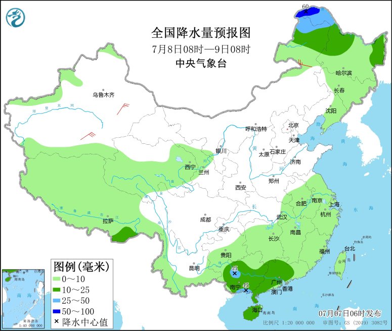 7月8日08時至9日08時,內(nèi)蒙古東北部、黑龍江西部和東部、華南大部等地部分地區(qū)有中到大雨,其中,內(nèi)蒙古東北部、黑龍江西北部等地部分地區(qū)有暴雨(50~60毫米)。新疆沿天山地區(qū)和南疆盆地等地部分地區(qū)有4~6級風(fēng)。南海西南部海域?qū)⒂?~6級、陣風(fēng)7級的偏西風(fēng)。