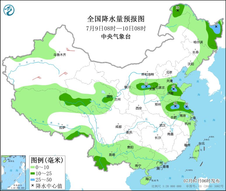 7月9日08時至10日08時,內(nèi)蒙古東北部、東北地區(qū)東部、西北地區(qū)中部、華北中西部和南部、黃淮大部、江淮大部、華南大部、臺灣島等地有小到中雨,其中,黑龍江東北部、山西中部、山東中部、蘇皖北部等地部分地區(qū)有大雨(25~45毫米)。新疆沿天山地區(qū)和南疆盆地等地部分地區(qū)有4~6級風(fēng)。南海南部海域?qū)⒂?~6級、陣風(fēng)7級的偏西到西南風(fēng)。