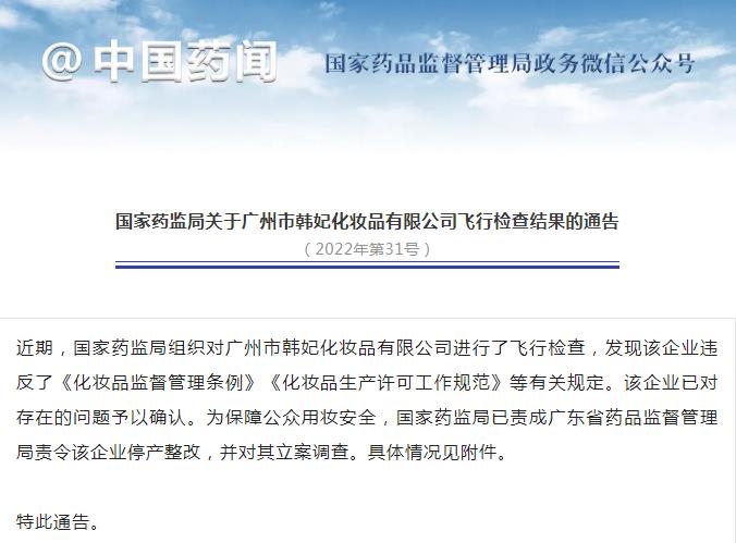 國(guó)家藥監(jiān)局:對(duì)廣州市韓妃化妝品有限公司立案調(diào)查