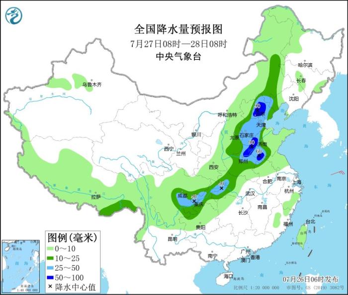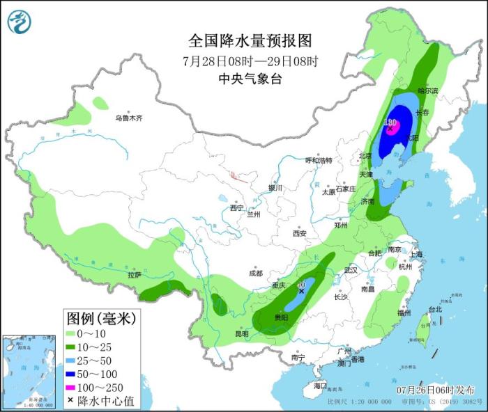 圖2 全國降水量預報圖(7月26日08時-27日08時)