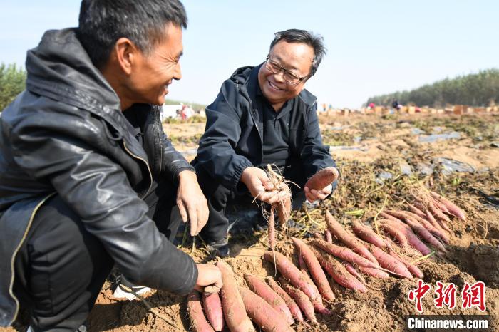 如今,新鮮采挖的甘薯一排排擺在地頭,顏色鮮艷、個(gè)大飽滿?!爱€產(chǎn)6千斤以上,不同品種收購(gòu)價(jià)格不同,鮮食型紅薯在地頭就能賣到每斤1.5元到1.7元,往常果腹的小甘薯成了農(nóng)民致富的‘金坨坨’?!备咔逑舱f(shuō)。