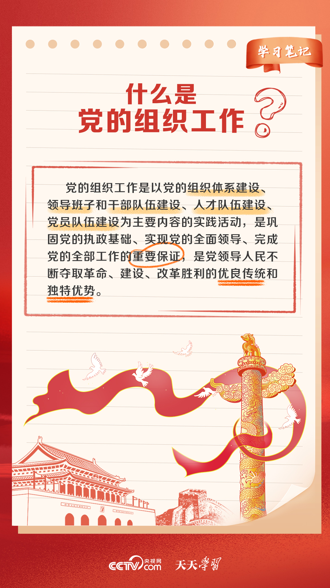 黨的力量來自組織,組織嚴(yán)密是黨的光榮傳統(tǒng)和獨(dú)特優(yōu)勢,正如習(xí)近平總書記所說,黨的全面領(lǐng)導(dǎo)、黨的全部工作要靠黨的堅(jiān)強(qiáng)組織體系去實(shí)現(xiàn)。什么是黨的組織工作?全國組織工作會議是個怎樣的會議?央視網(wǎng)《天天學(xué)習(xí)》帶您了解。
