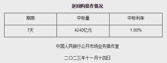 中新網(wǎng)11月14日電 據(jù)央行網(wǎng)站消息,為維護(hù)銀行體系流動(dòng)性合理充裕,2023年11月14日人民銀行以利率招標(biāo)方式開展了4240億元逆回購操作,中標(biāo)利率1.80%,期限為7天。具體情況如下: