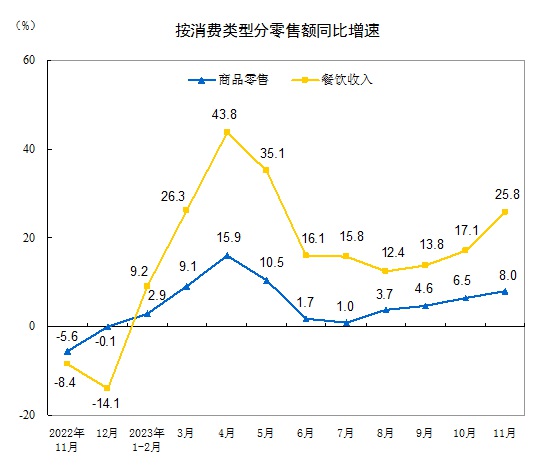 按消費(fèi)類型分,11月份,商品零售36925億元,同比增長(zhǎng)8.0%;餐飲收入5580億元,增長(zhǎng)25.8%。1—11月份,商品零售380460億元,同比增長(zhǎng)5.9%;餐飲收入47485億元,增長(zhǎng)19.4%。