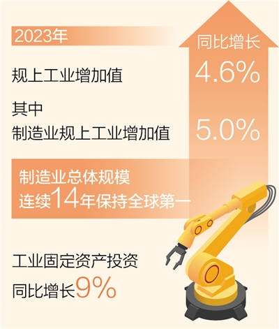 本報(bào)北京1月21日電 (記者王政、劉溫馨)記者日前從工業(yè)和信息化部獲悉:2023年,全年規(guī)模以上工業(yè)增加值同比增長4.6%,較2022年提升1個(gè)百分點(diǎn),其中制造業(yè)規(guī)模以上工業(yè)增加值同比增長5.0%,我國制造業(yè)總體規(guī)模連續(xù)14年保持全球第一。