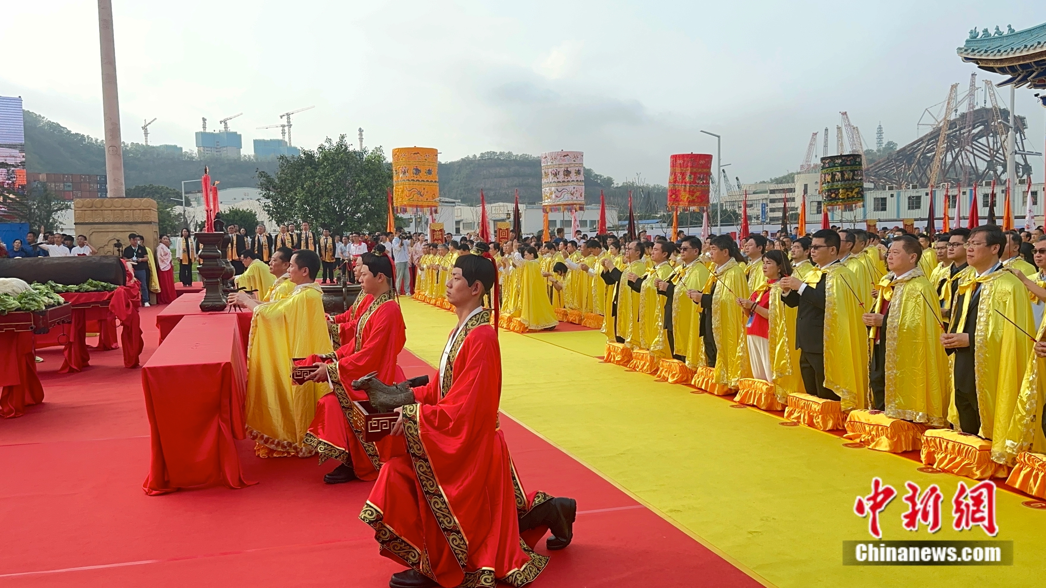 上午7點(diǎn)30分,正祭儀式正式開始。深圳南山天后博物館遵循古制,恢復(fù)古禮,結(jié)合嶺南傳統(tǒng)文化,再現(xiàn)明代“辭沙”祭祀的場(chǎng)景。大典現(xiàn)場(chǎng),祭祀嘉賓和承獻(xiàn)官等在主持人的引導(dǎo)下,將祭祀流程一一完整演繹。