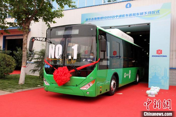 5月20日,吉爾吉斯斯坦1000臺中通客車首批車輛下線儀式在山東聊城舉行,圖為已經(jīng)下線的10.5米中通天然氣公交車?!≈行律缬浾?孫婷婷 攝