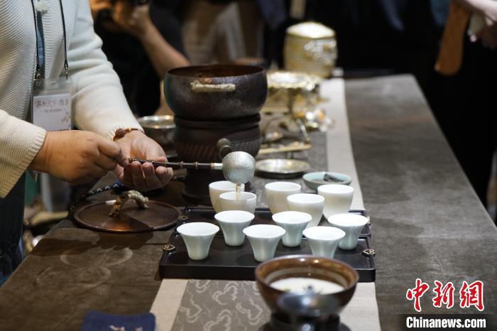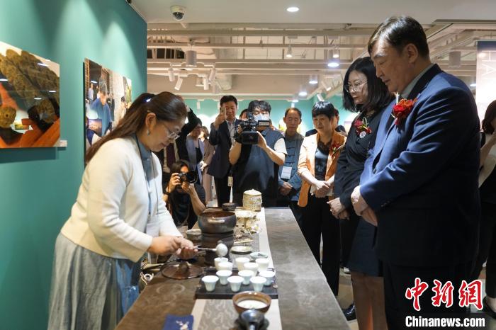 當(dāng)?shù)貢r間23日,“茶和天下·雅集”活動開幕式暨茶韻山水——“綠水青山就是金山銀山”浙江省文旅圖片展在首爾中國文化中心舉行。圖為長興紫筍茶體驗(yàn)。中新社記者 劉旭 攝