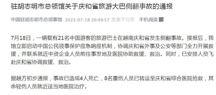 據(jù)越方初步通報,事故已造成4人死亡,8名重傷人員已轉(zhuǎn)運至慶和省綜合醫(yī)院搶救,其余輕傷人員就近送當?shù)蒯t(yī)院治療。