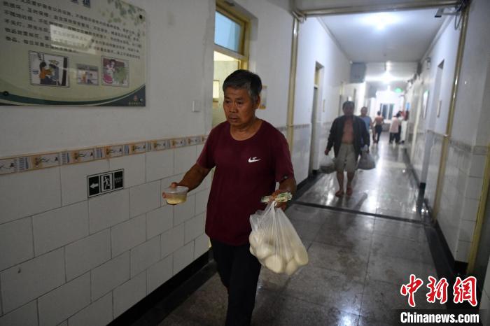 這是一間有八張床位的學(xué)生宿舍,屋頂?shù)碾娚纫恢贝抵?。?dāng)記者走進(jìn)房間時,劉玉霞正吃著丈夫剛領(lǐng)回的盒飯?!耙粋€是白菜粉條,一個是木須肉,還有湯,挺好?!痹诶先丝磥恚晏炖锍钥跓犸?,“家人平安已知足”。