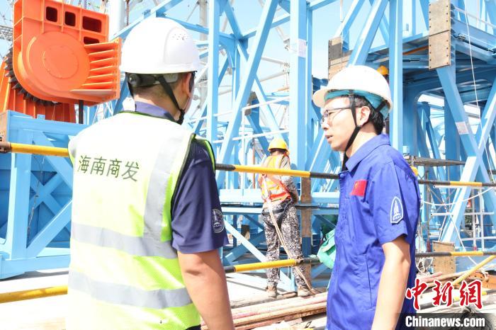 圖為首俊明在海南商業(yè)航天發(fā)射場(chǎng)1號(hào)工位向工人了解項(xiàng)目建設(shè)進(jìn)展。符宇群攝