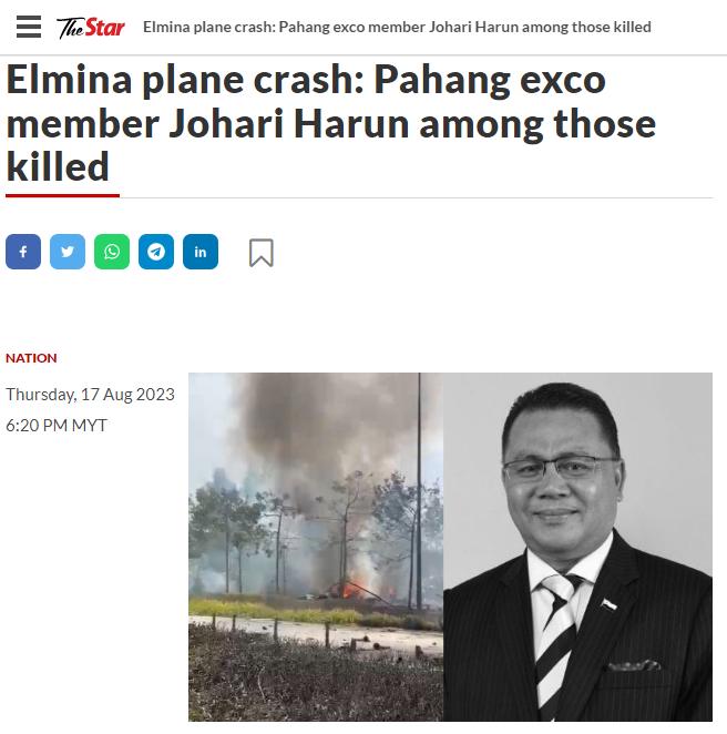 中新網(wǎng)8月17日電 據(jù)馬來西亞《星州日報》援引警方消息稱,當(dāng)?shù)貢r間17日,馬來西亞雪蘭莪州發(fā)生墜機(jī)事故,造成至少10人死亡,其中一名死者為該國彭亨州行政議員喬哈里·哈倫。