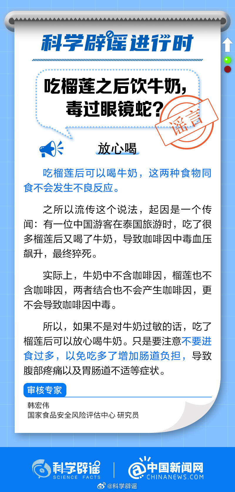 中新網(wǎng)8月24日電 吃榴蓮后可以喝牛奶,這兩種食物同食不會發(fā)生不良反應。之所以流傳這個說法,起因是一個傳聞:有一位中國游客在泰國旅游時,吃了很多榴蓮后又喝了牛奶,導致咖啡因中毒血壓飆升,最終猝死。實際上,牛奶中不含咖啡因,榴蓮也不含咖啡因,兩者結合也不會產(chǎn)生咖啡因,更不會導致咖啡因中毒。(來源:@科學辟謠 @中國新聞網(wǎng) )