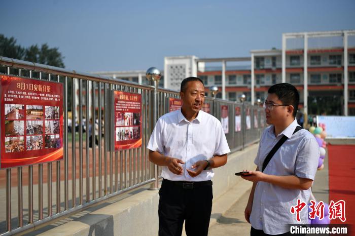 9月1日,涿州市刁窩中學(xué)校長孫常見(左)向中新社記者講述“筑夢路”背后的故事?!≈行律缬浾?翟羽佳 攝