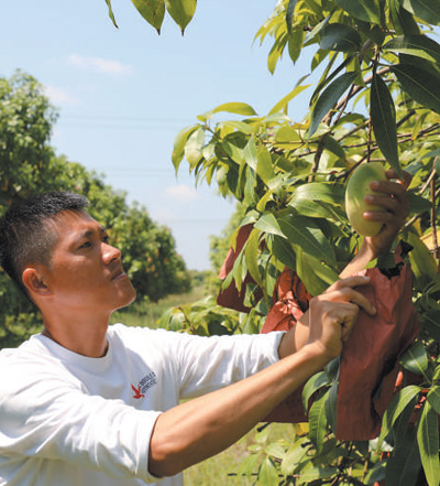柬埔寨磅士卑省一個(gè)芒果園內(nèi),果園主管布南正在細(xì)致檢查芒果長勢。該果園生產(chǎn)優(yōu)質(zhì)芒果,遠(yuǎn)銷至中國、俄羅斯、日本和韓國。