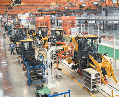 6月2日,廣西柳州市柳工裝載機(jī)燈塔工廠里,工人在升級后的車間里趕制海外訂單。