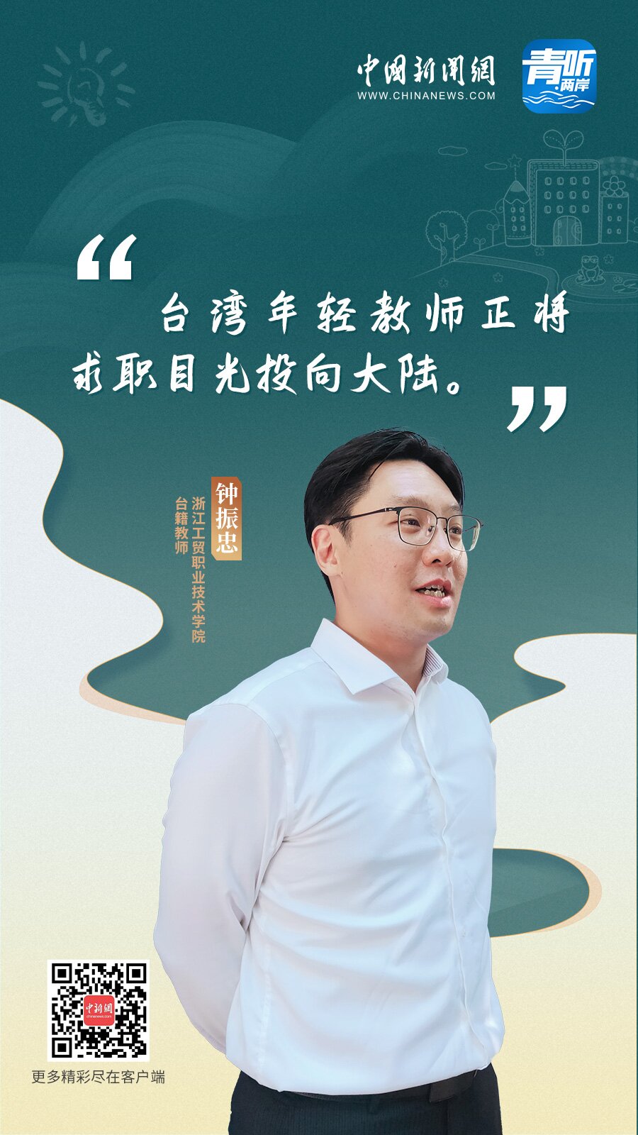 中新網(wǎng)9月10日電 (記者 程子倬 陳文韜)如今,越來越多的臺籍教師擁抱大陸發(fā)展機遇,赴大陸任教、立業(yè)筑夢,融入當?shù)厣睢=?,在中國新聞網(wǎng)《青聽·兩岸》節(jié)目中,幾位在大陸不同教育機構(gòu)任職的臺灣青年教師分享了各自融入大陸教育行業(yè)的故事,以及他們對大陸教育事業(yè)的觀察。