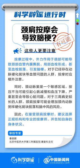 中新網(wǎng)10月12日電 按摩過程中,外力作用于頸部可能導(dǎo)致頸部血管內(nèi)膜撕脫、局部血栓形成,甚至血栓脫落,引發(fā)腦梗。在接受頸肩按摩時(shí),建議選擇正規(guī)機(jī)構(gòu)和專業(yè)的按摩師,并告知自身的身體狀況。(來源:@科學(xué)辟謠 @中國新聞網(wǎng) )